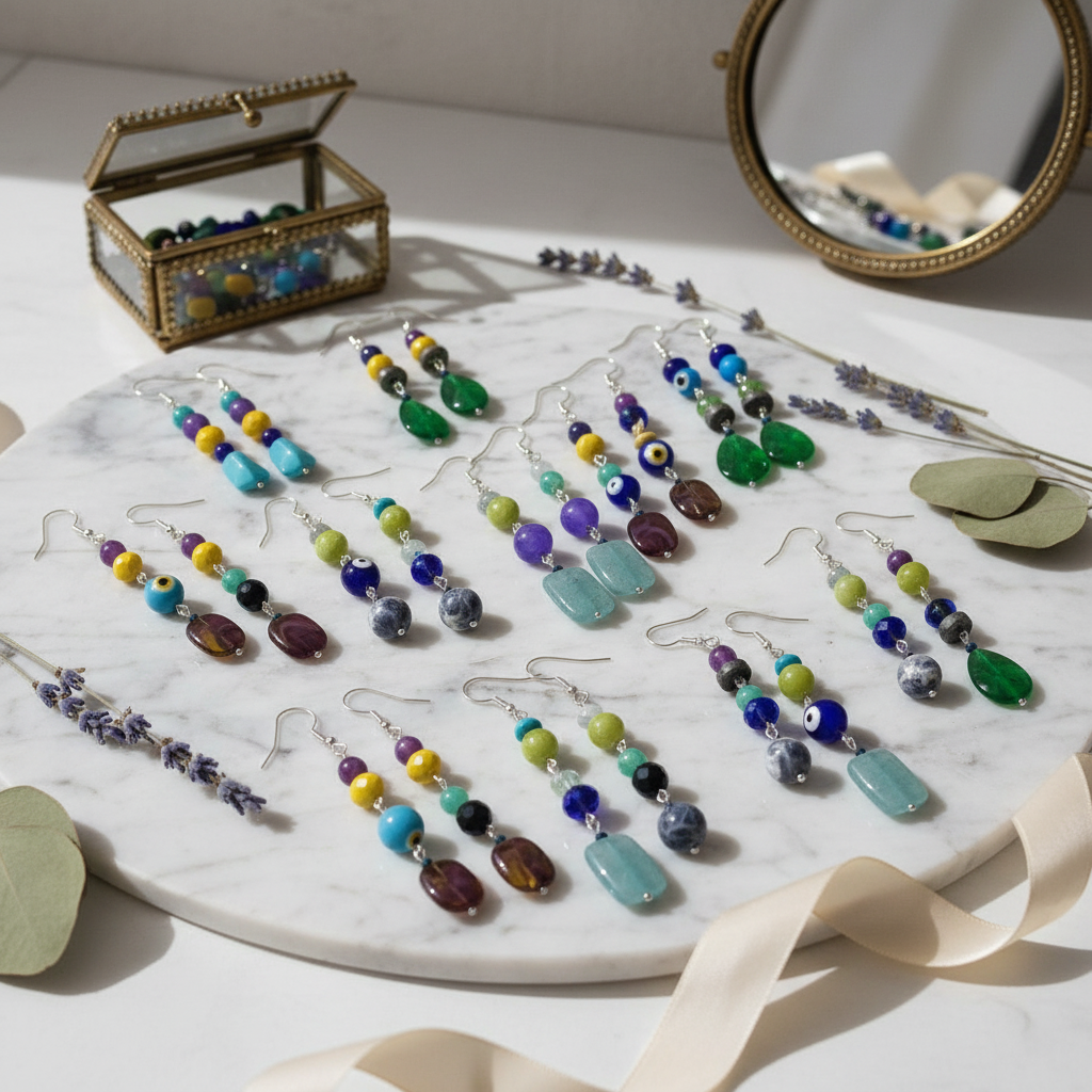search the ocean blue, and you still won’t find a collection quite like this! Handcrafted with love using stone beads, dazzling opaque glass, and silver colored findings. Hook posts with rubber backs