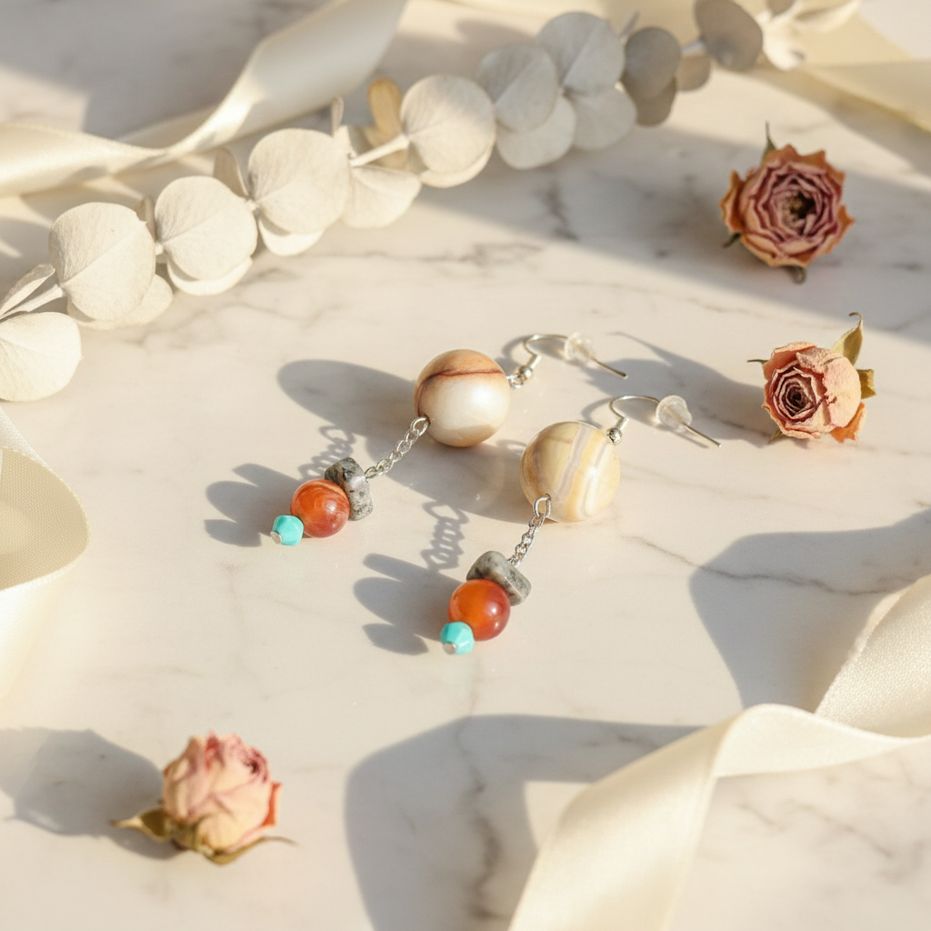 Handcrafted with love using glass and stone crystal beads and silver-colored findings. Hook posts with rubber backs.